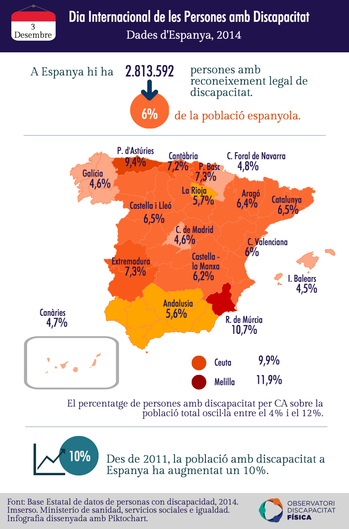 Si s'analitzen les dades per territori s'observa que el percentatge de persones amb discapacitat per comunitat autònoma oscil·la entre el 4% i el 12%; sent Melilla i la Regió de Múrcia els territoris amb dades de prevalença més elevades.