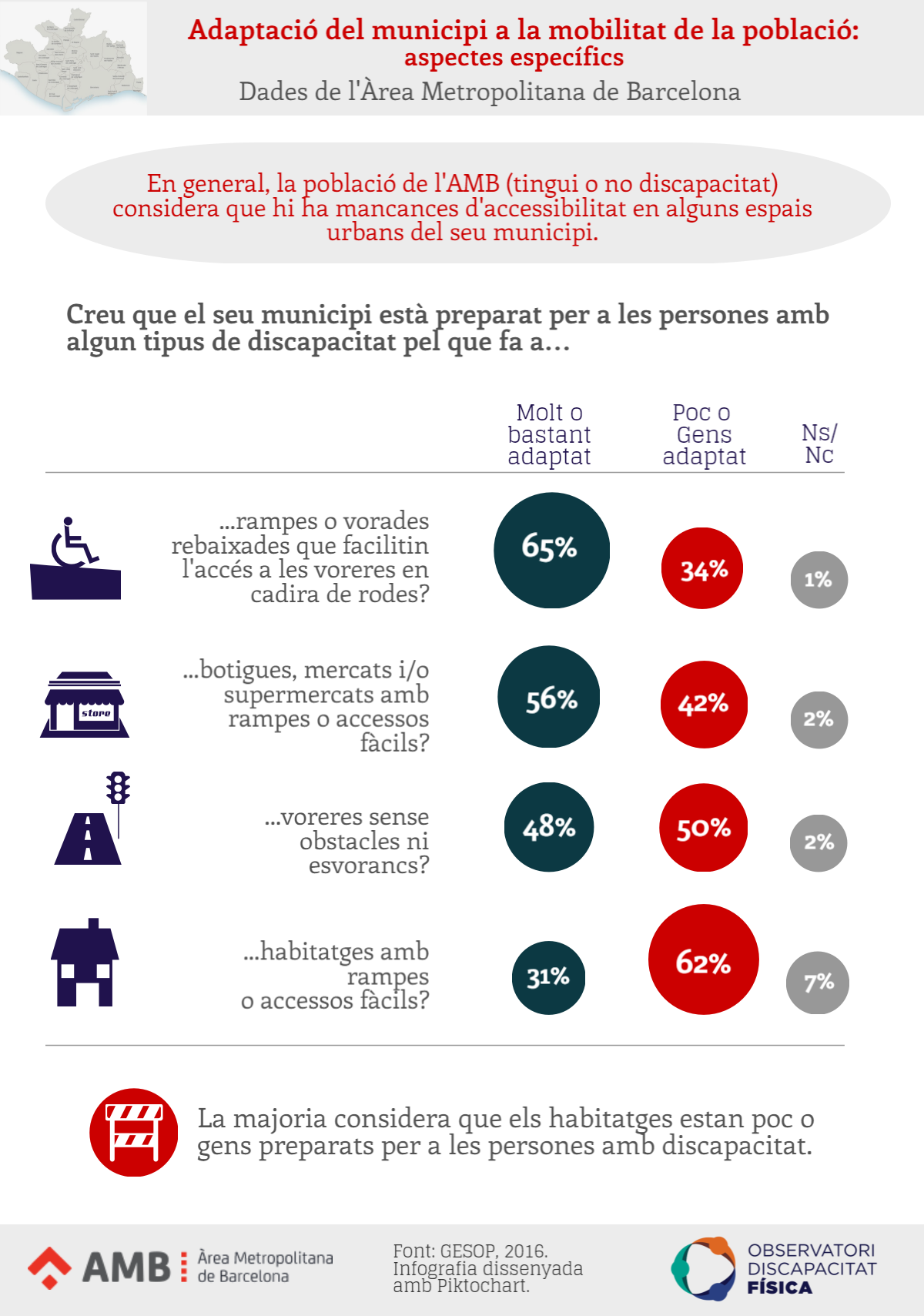 La població de l’AMB considera que l’accessibilitat d’alguns dels espais urbans del seu municipi té mancances i, si es considera l’accessibilitat dels habitatges, la majoria considera que els immobles estan poc o gens adaptats (per a persones amb discapacitat); de fet el 62% de la població de l’AMB creu que els habitatges del seu municipi estan poc o gens adaptats mitjançant rampes o accessos fàcils.