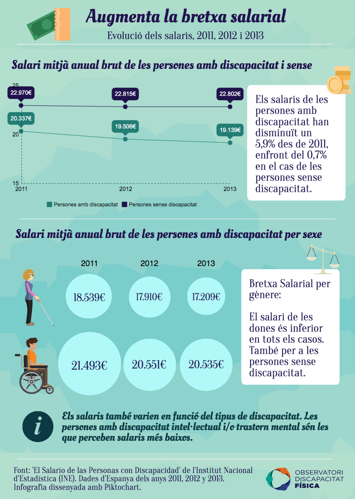 Segons dades de l'Institut Nacional d'Estadística, els salaris de les persones amb discapacitat han disminuït un 5,9% de l'any 2011 a 2013, enfront del 0,7% en el cas de les persones sense discapacitat. Durant aquests anys la bretxa salarial entre persones amb discapacitat i sense ha augmentat a Espanya.