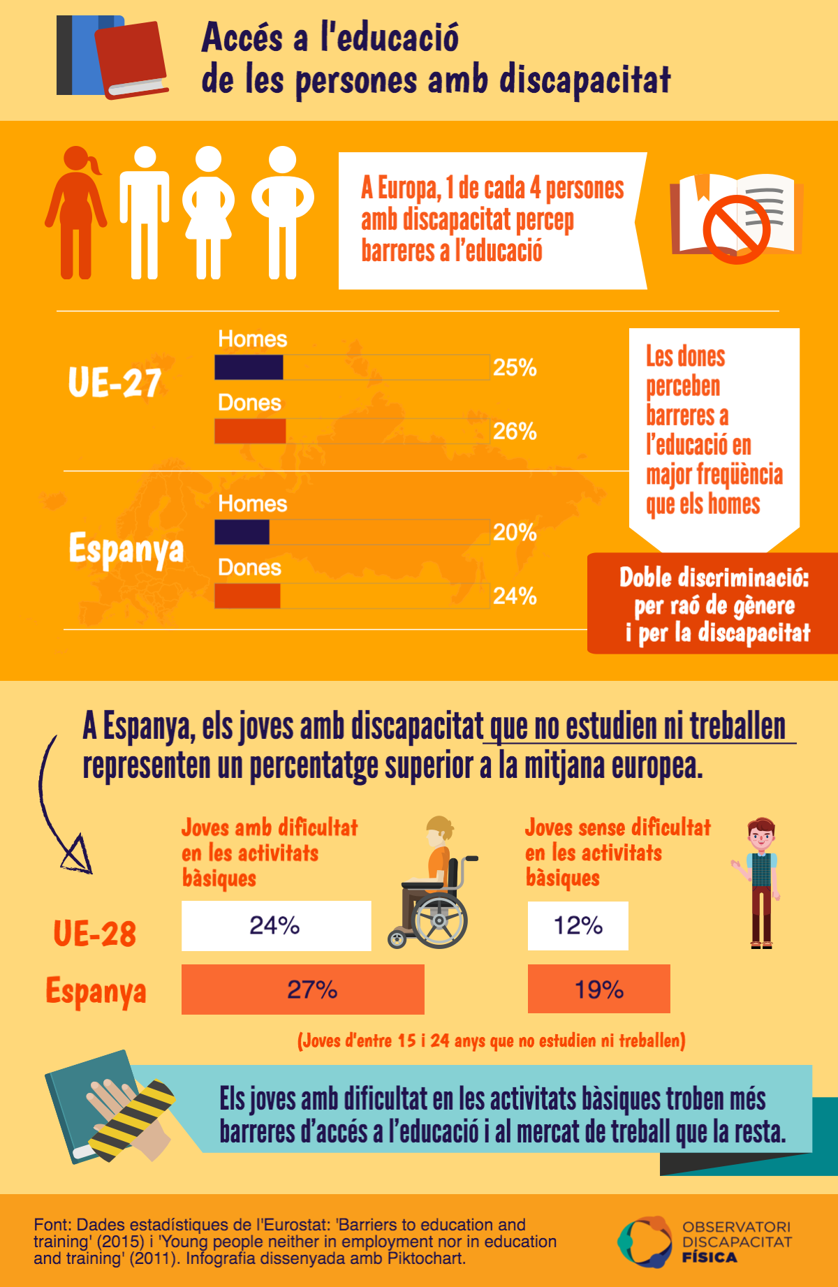 A Europa, 1 de cada 4 persones amb discapacitat percep barreres a l'educació. Tot i que les xifres són similars pel que fa a la distribució per sexe, les dones perceben barreres a l'educació en major freqüència que els homes. En aquest sentit, podríem trobar-nos davant de la doble discriminació que pateixen les dones amb discapacitat: per raó de gènere i per la discapacitat.