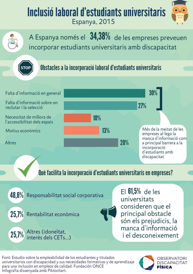 A Espanya, el 2015 només el 34,38% de les empreses preveia incorporar estudiants universitaris amb discapacitat. Aquesta xifra es deu en gran part, i segons opinió de les empreses, a la falta d’informació; doncs la meitat d’aquestes consideren que la falta d’informació en general o la falta d’informació sobre el procés de reclutar i seleccionar estudiants són els principals obstacles a la incorporació d’estudiants universitaris amb discapacitat a l’empresa.