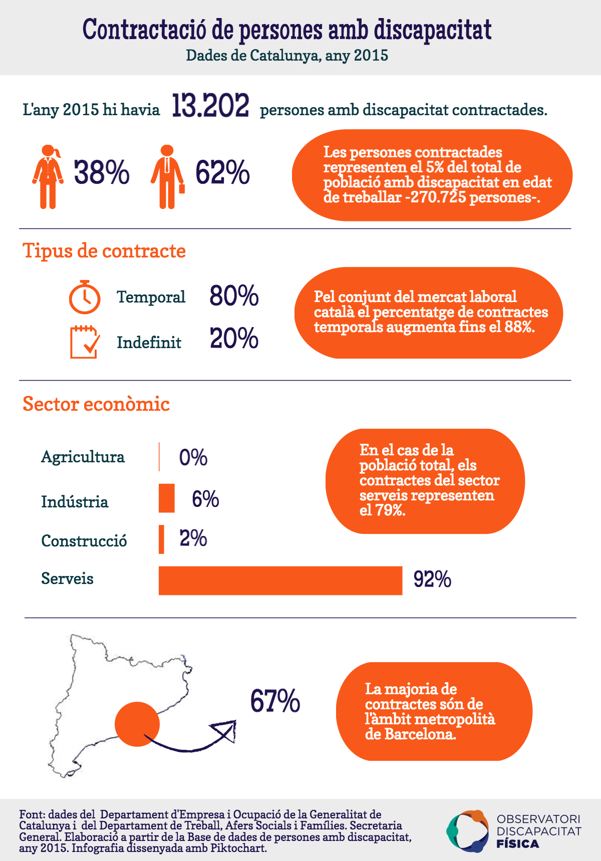 L'any 2015 hi havia 13.202 persones amb discapacitat contractades a Catalunya. Les persones contractades representen el 5% del total de població amb discapacitat en edat de treballar -270.725 persones-. Els homes representen el 62% de la població amb discapacitat contractada mentre les dones tenen menor presència -38%-.