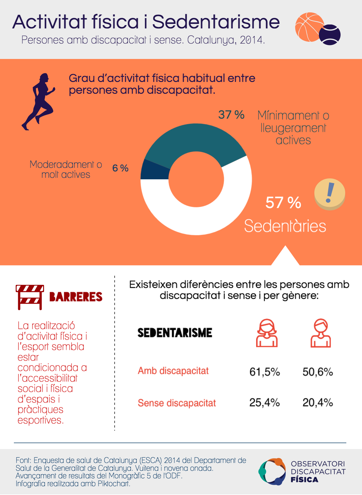 Les dades comparades entre homes i dones segons tinguin o no una discapacitat mostren que les diferències són especialment grans en relació a la discapacitat. És a dir, la realització d’activitat física i l’esport sembla estar condicionada a l’accessibilitat social i física d’espais i pràctiques esportives. Així, entre els homes amb discapacitat, el 50,6% té un estil de vida sedentari enfront el 20,4% dels homes sense discapacitat. Pel que fa a les dones la distància augmenta fins al 36% entre aquelles amb discapacitat i sense.