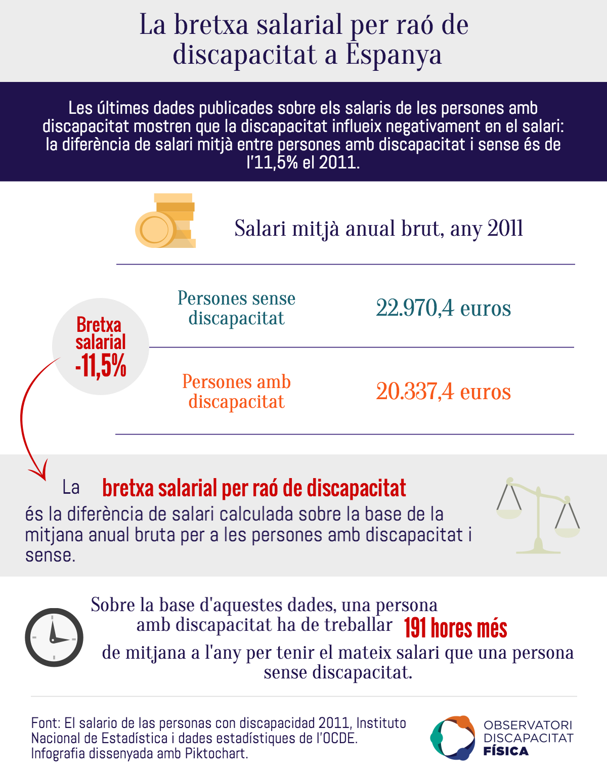 Les últimes dades publicades sobre els salaris de les persones amb discapacitat mostren que la discapacitat influeix negativament en el salari: la diferència de salari mitjà entre persones amb discapacitat i sense és de l'11,5% el 2011, aquesta distància s'anomena bretxa salarial.