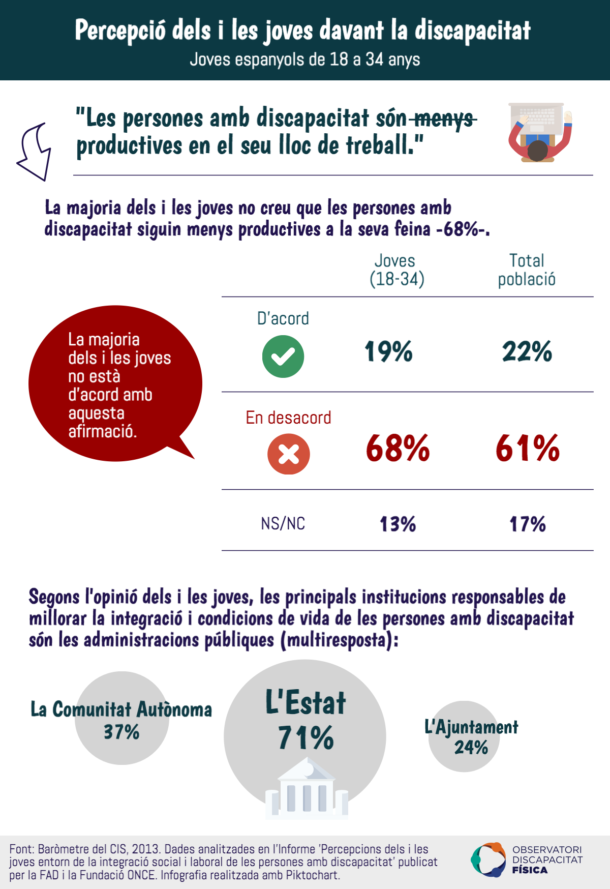 El Baròmetre del CIS de 2013 recull dades sobre la percepció de la societat davant la discapacitat. Quan es pregunta per la productivitat de les persones amb discapacitat en el seu lloc de feina, la majoria de la població no creu que siguin menys productius -61%-. En relació als joves espanyols, d'entre 18 i 34 anys, aquest percentatge augmenta fins el 68%; és a dir, la majoria dels i les joves no creu que les persones amb discapacitat siguin menys productives a la seva feina.