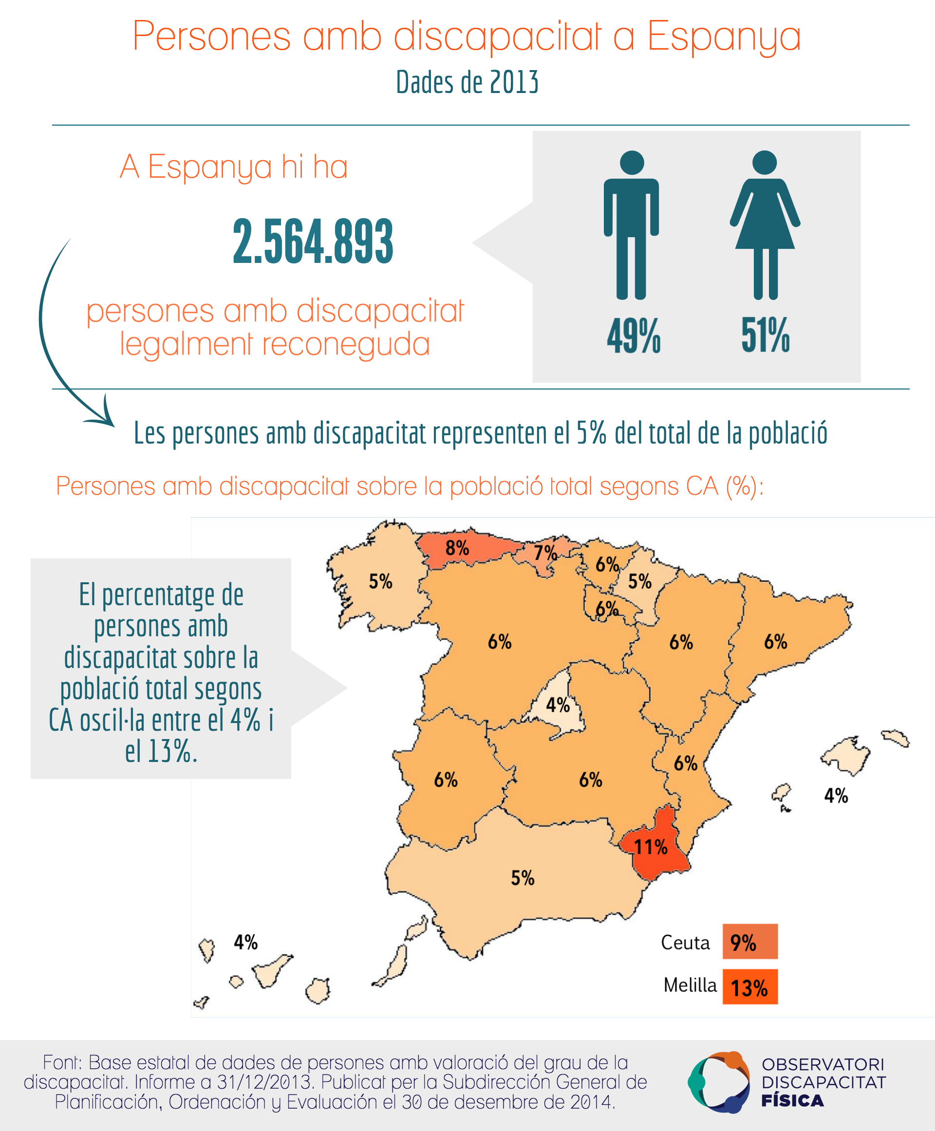 El percentatge de persones amb discapacitat sobre la població total segons la Comunitat Autònoma oscil·la entre el 4% i el 13%. La Ciutat de Melilla i la Regió de Múrcia són els territoris que agrupen un major percentatge de persones amb discapacitat -concretament el 13% i l'11% respectivament-. D'altra banda, les CA amb menor percentatge són Madrid, les Illes Balears i les Illes Canàries -4%-.