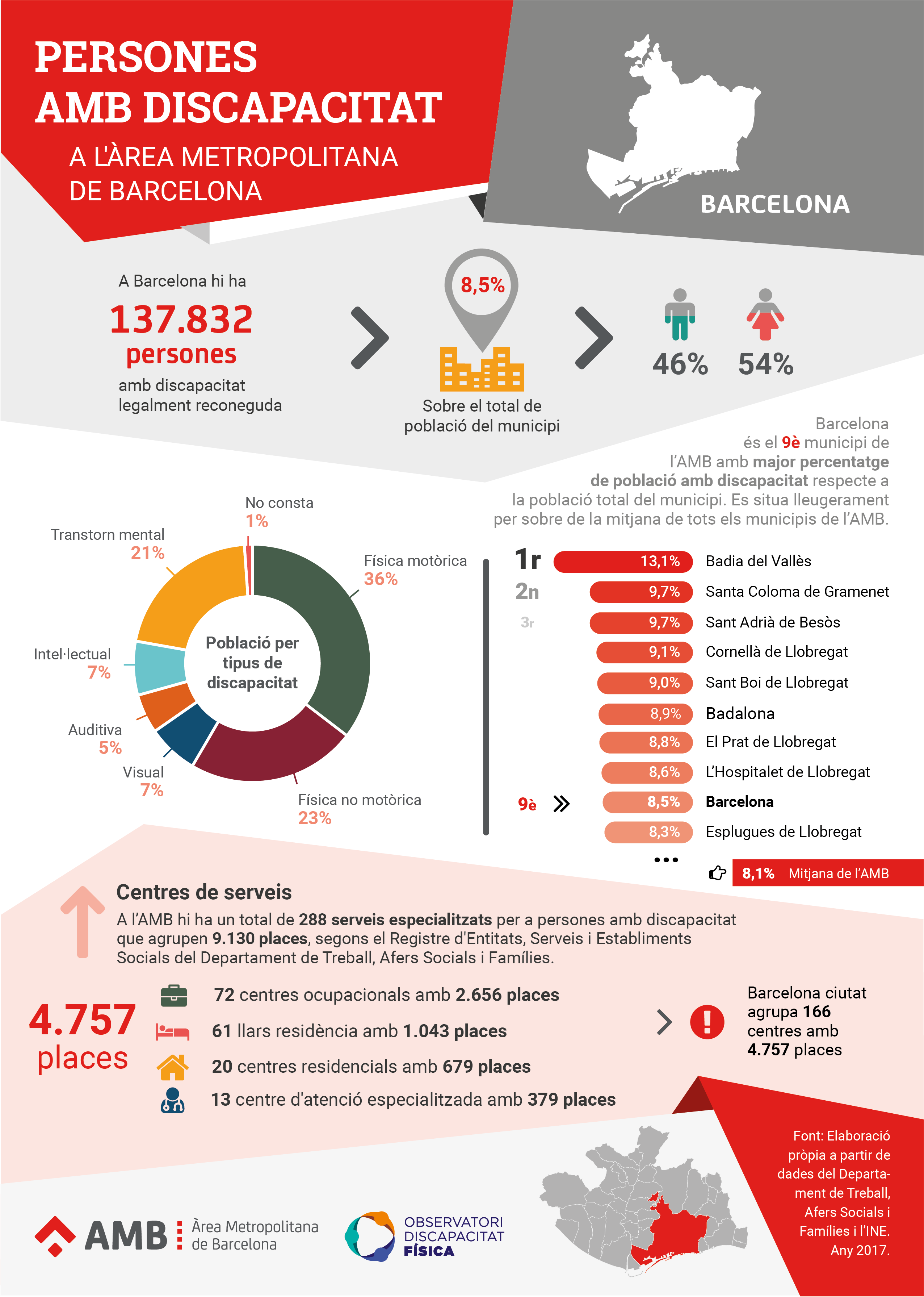 Segons el Registre d'Entitats, Serveis i Establiments Socials del Departament de Treball, Afers Socials i Famílies, a l’AMB hi ha un total de 288 serveis especialitzats per a persones amb discapacitat que sumen 9.130 places. Barcelona ciutat agrupa 166 centres amb 4.757 places, sent el municipi amb major nombre de serveis i establiments socials especialitzats per al col·lectiu.