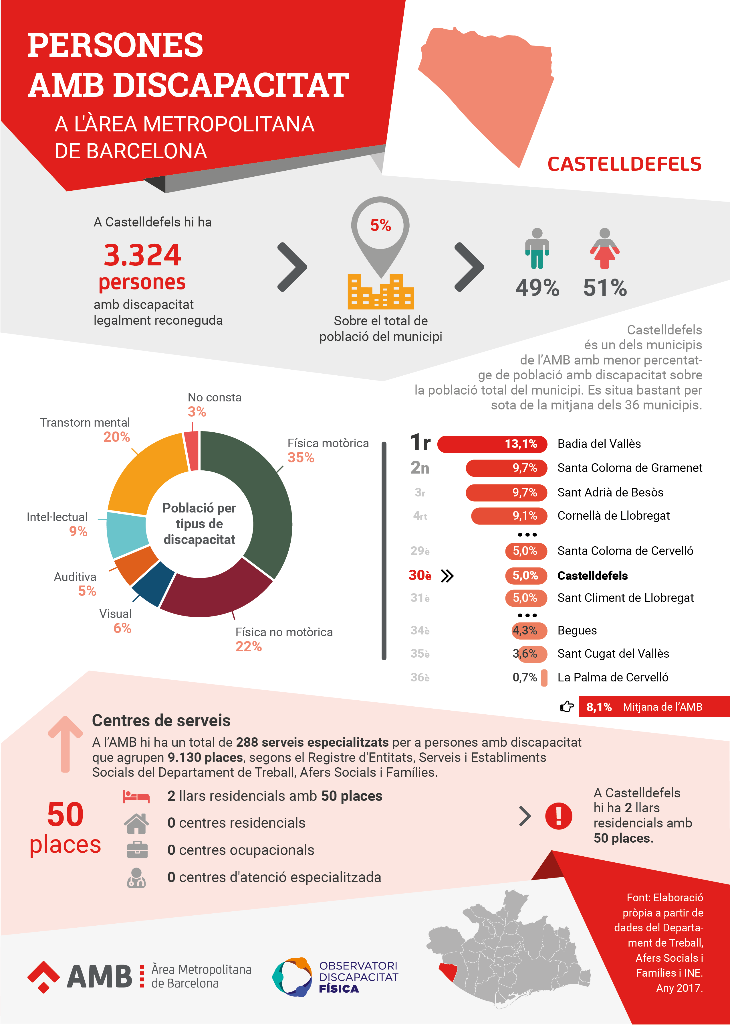 Castelldefels és un dels municipis de l’Àrea Metropolitana de Barcelona amb menor percentatge de persones amb discapacitat sobre la població total del municipi. Es situa per sota de la mitjana dels 36 municipis (8,1%). Concretament, és el 30è municipi de l’AMB pel que fa a població amb discapacitat en termes relatius.