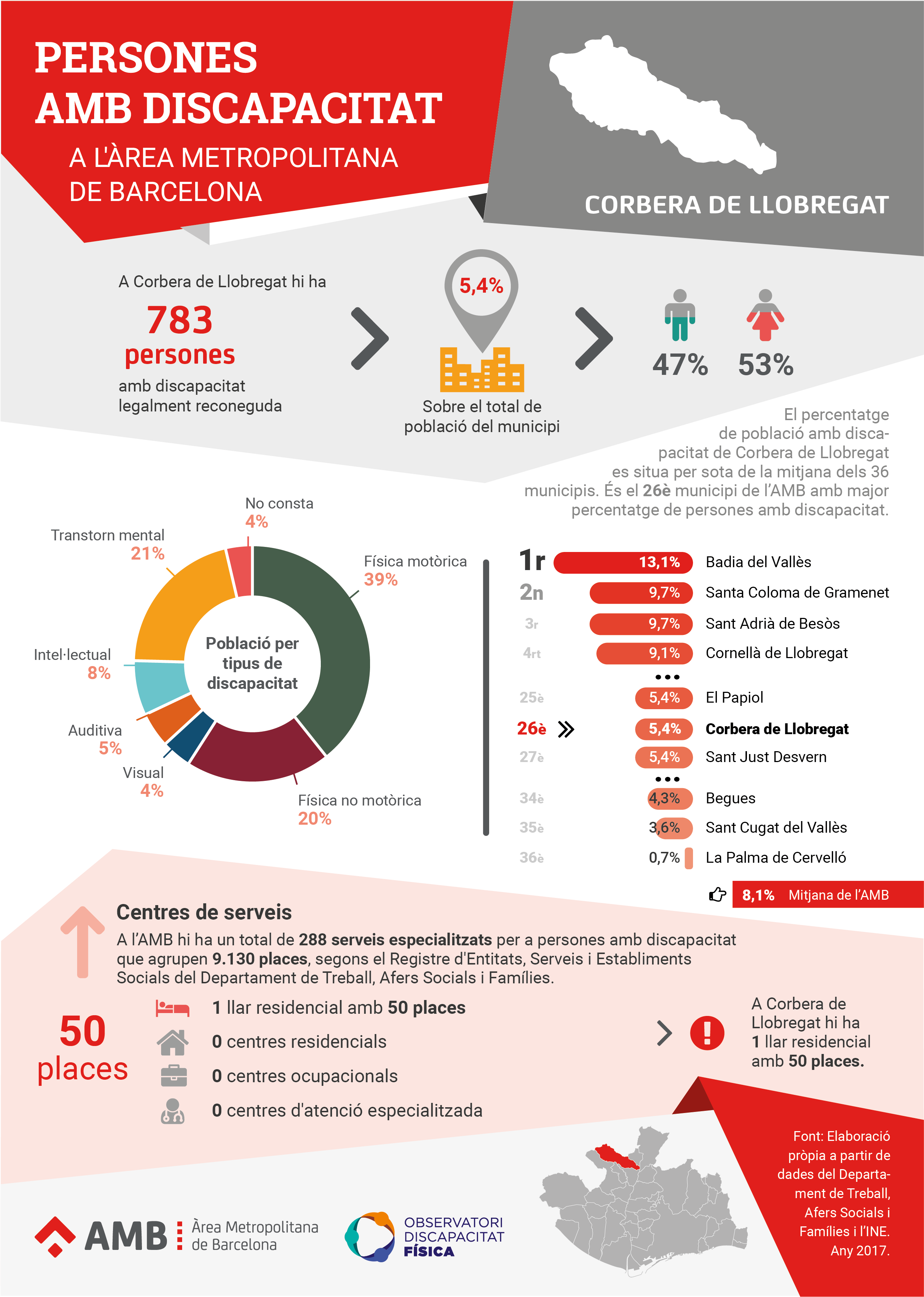 Segons el Registre d'Entitats, Serveis i Establiments Socials del Departament de Treball, Afers Socials i Famílies, a l’AMB hi ha un total de 288 serveis especialitzats per a persones amb discapacitat que sumen 9.130 places. A Corbera de Llobregat trobem 1 llar residencial amb 50 places.