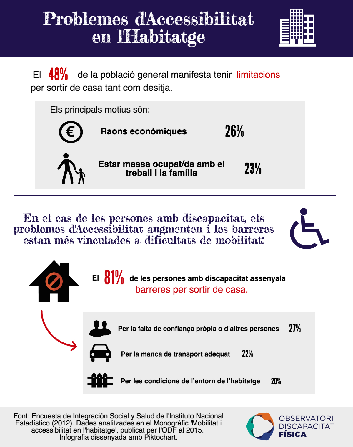 En el cas de les persones amb discapacitat, el 81% assenyala barreres per sortir de casa, principalment per la falta de confiança pròpia o d’altres persones com a barrera principal —27%—. Seguidament, aquest col·lectiu apunta altres limitacions que estan més vinculades a la mobilitat: el 22% de les persones amb discapacitat afirma que no pot sortir de casa tant com desitja per falta de transport adequat i el 20% ho atribueix a les condicions de l’entorn de l’habitatge.