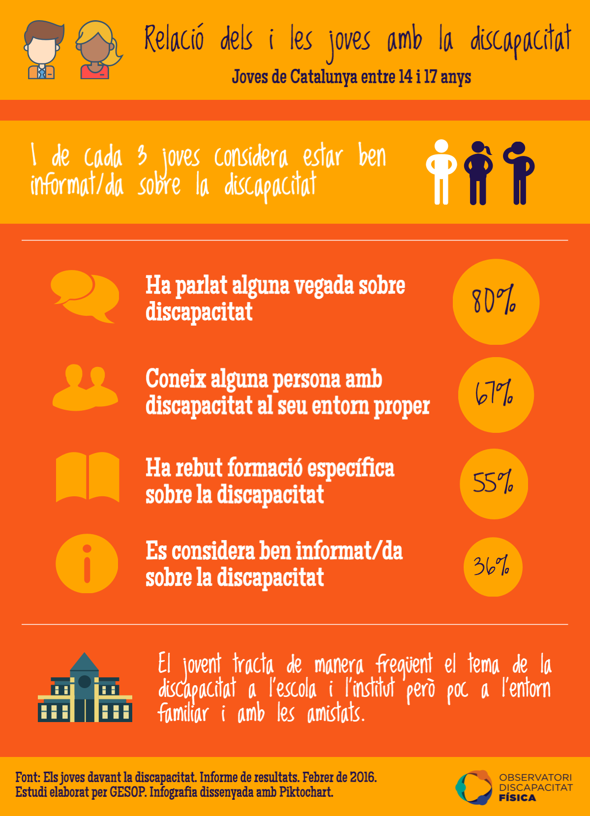 Segons dades de GESOP, 1 de cada 3 joves de Catalunya (entre 14 i 17 anys) considera estar ben informat/da sobre la discapacitat. El 80% ha parlat alguna vegada sobre discapacitat, el 67% coneix alguna persona amb discapacitat al seu entorn proper i el 55% ha rebut formació específica sobre la discapacitat. En termes general, el jovent tracta de manera freqüent el tema de la discapacitat a l'escola i l'institut però poc a l'entorn familiar i amb les amistats.