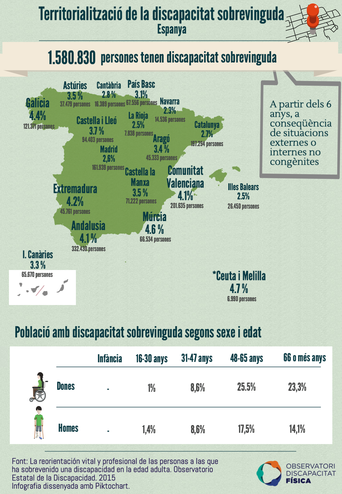 Les Comunitats Autònomes amb presència de més població amb discapacitat sobrevinguda són, per aquest ordre, Andalusia, Comunitat Valenciana, Catalunya, Comunitat de Madrid, Galícia i Castella i Lleó. No obstant, si considerem la seva població, aquest ordre varia significativament, i destaquen per sobre de la resta de territoris, les ciutats autònomes de Ceuta i Melilla (4,7%), Murcia (4,6%), Galícia (4,4%) i Extremadura (4,2%).