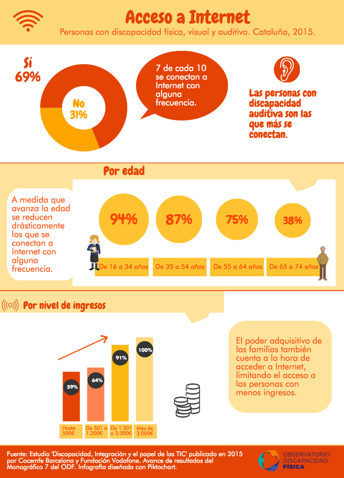 Otro de los factores que interviene en el acceso a las TIC es la edad. La juventud tiene más acceso en internet que las personas mayores, pasando del 94% de acceso entre la población de 16 a 34 años al 38% entre la población de 65 a 74 años. El nivel de ingresos en el hogar, es decir, el poder adquisitivo de las familias, también cuenta a la hora de acceder a internet, limitando a las personas con menos ingresos y facilitándolo entre los grupos con más.