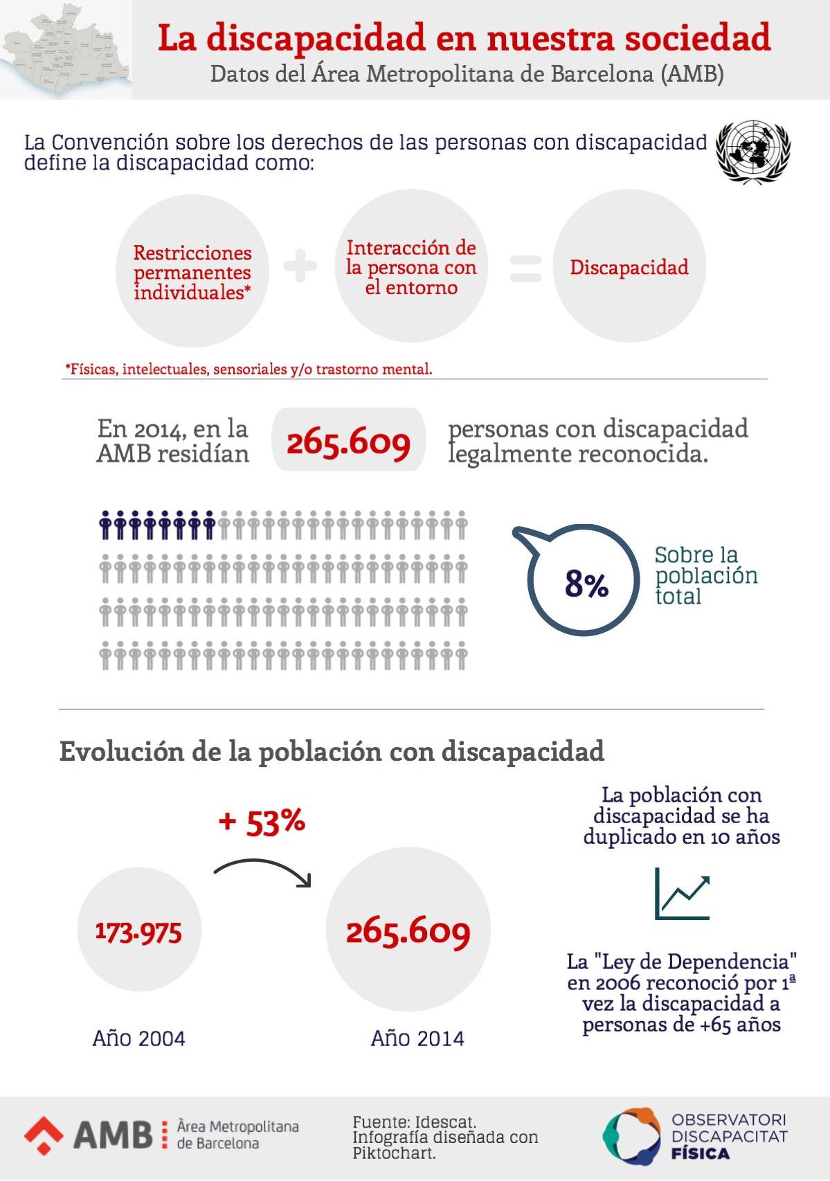 Además, el número de personas con discapacidad en la AMB en 10 años (desde 2004 a 2014) se ha duplicado, pasando de 173.975 en 2004 a 265.609 en 2014.