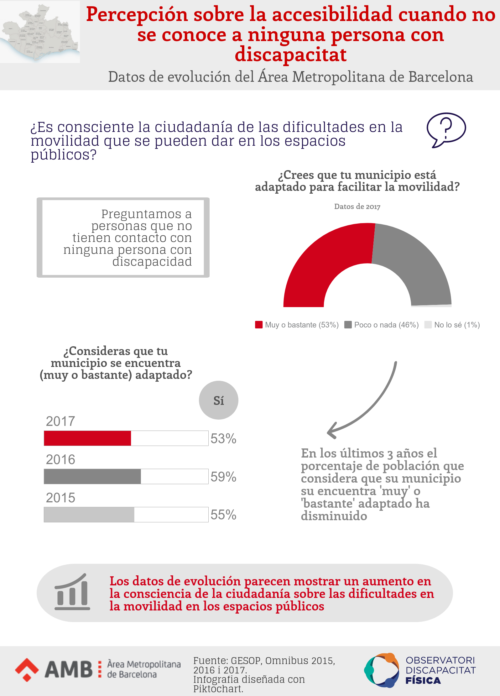 Con todo, los datos de evolución muestran como la percepción de barreras por parte de la ciudadanía de la AMB, que no tiene contacto con personas con discapacidad, ha aumentado en 2017, tanto respecto al 2015 cómo al 2016. Así, en 2015 el 55% de las personas encuestadas consideraba que su municipio estaba ‘muy’ o ‘bastante’ adaptado. En 2016 esta cifra aumenta al 59% y en 2017 baja al 53%. Estos resultados se pueden interpretar como indicativo de una mayor toma de conciencia por parte de la ciudadanía. A pesar de esto, dada la fluctuación de 2016, será necesario ampliar la serie para confirmar la tendencia.