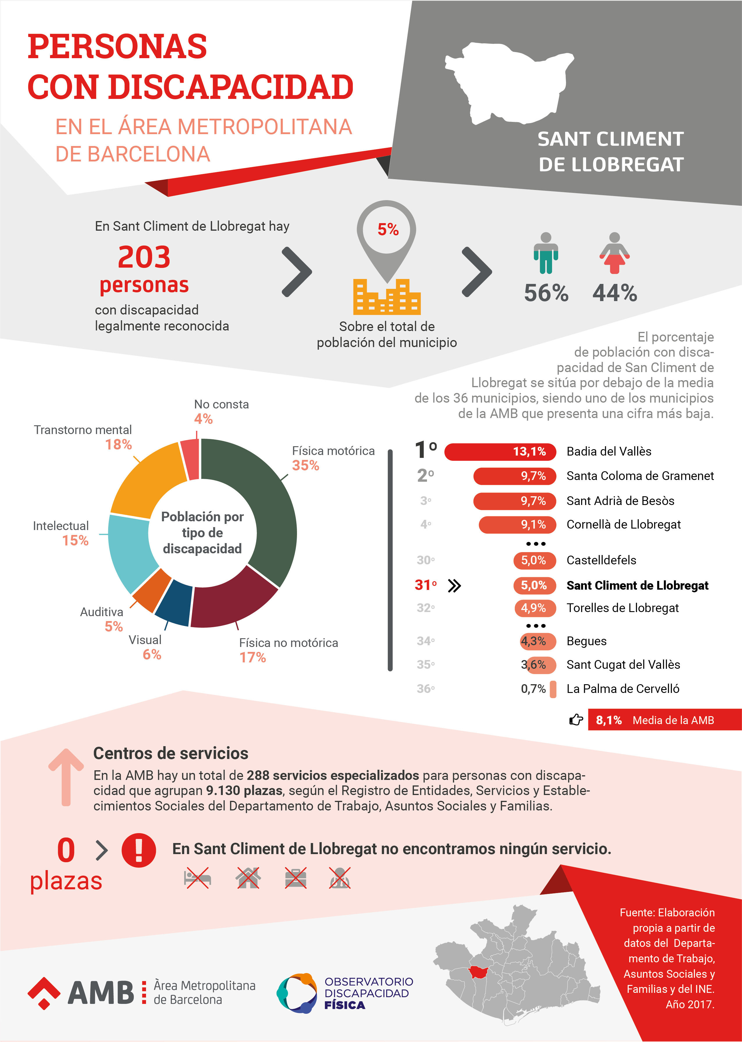 Según el Registro de Entidades, Servicios y Establecimientos Sociales del Departamento de Trabajo, Asuntos Sociales y Familias, a la AMB hay un total de 288 servicios especializados para personas con discapacidad que suman 9.130 plazas. En Sant Climent de Llobregat no encontramos ninguno de estos servicios.