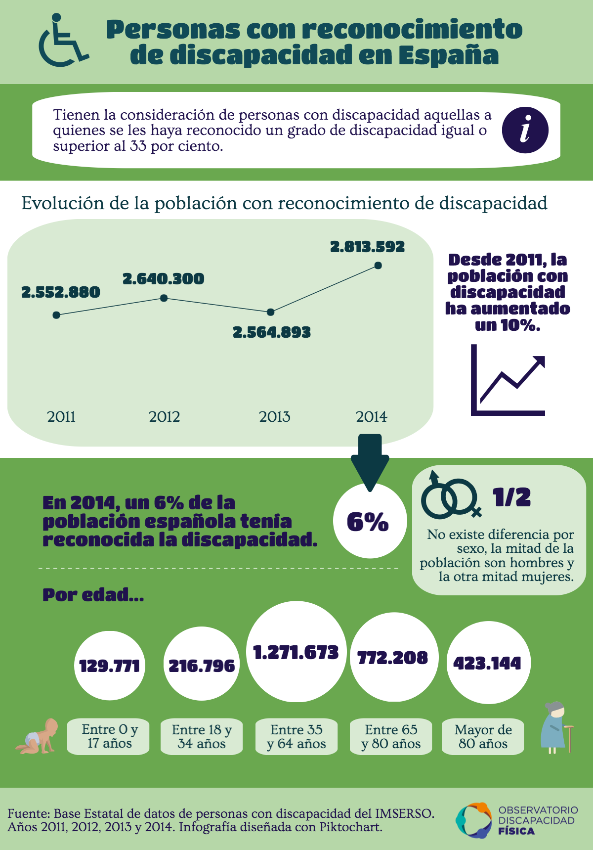 En primer lugar, hay que mencionar que tienen la consideración de personas con discapacidad aquellas a las que se les haya reconocido un grado de discapacidad igual o superior al 33 por ciento. Según la Base Estatal de datos de personas cono discapacidad del IMSERSO, desde 2011 a 2014, la población con discapacidad ha aumentado un 10%, pasando de 2.552.880 a 2.813.592 personas con discapacidad reconocida legalmente.