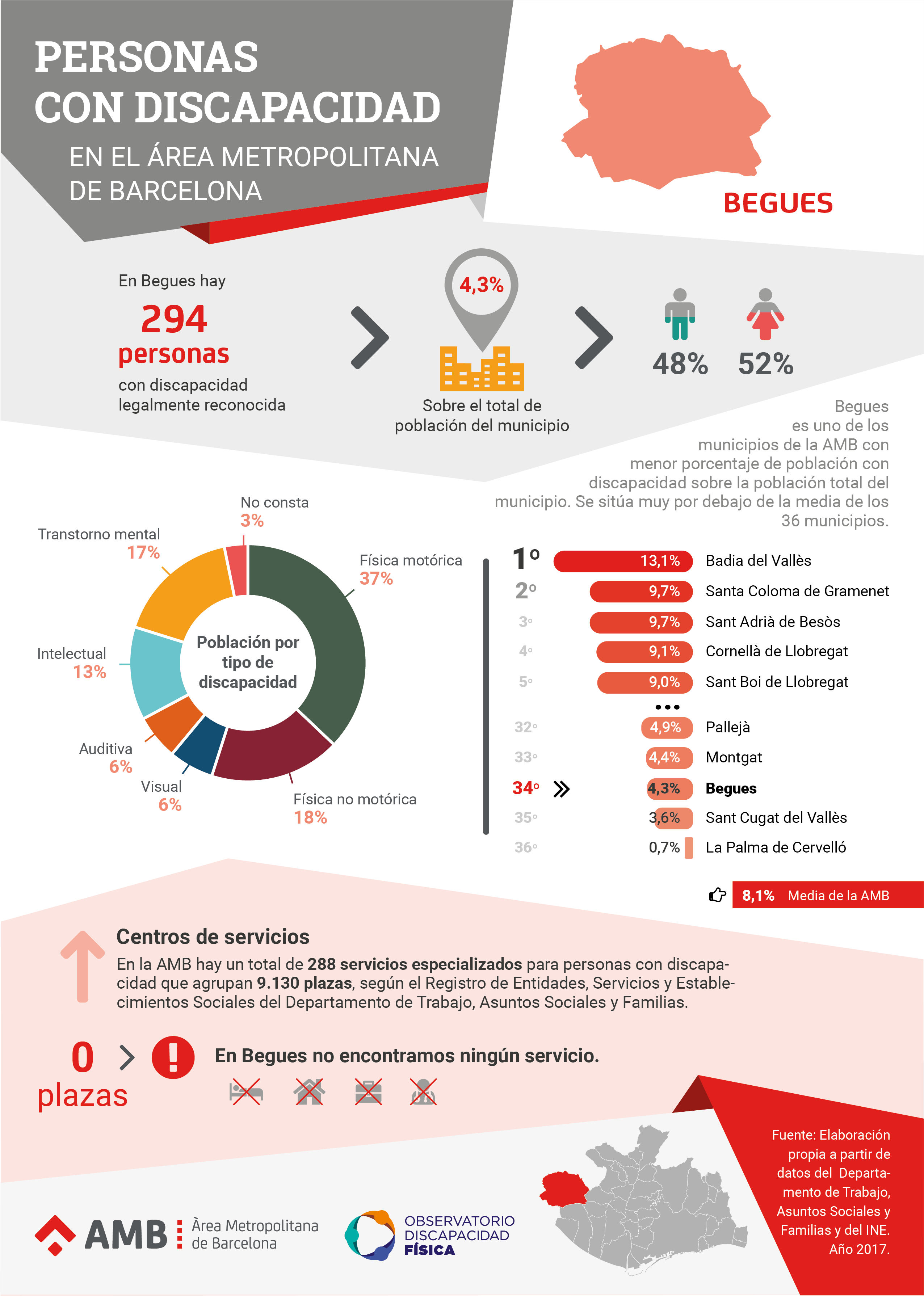 Según el Registro de Entidades, Servicios y Establecimientos Sociales del Departamento de Trabajo, Asuntos Sociales y Familias, en la AMB hay un total de 288 servicios especializados para personas con discapacidad que suman 9.130 plazas. En Begues no encontramos ninguno de estos servicios, la mayoría de se encuentran en Barcelona ciudad y en los municipios de la AMB con mayor población.