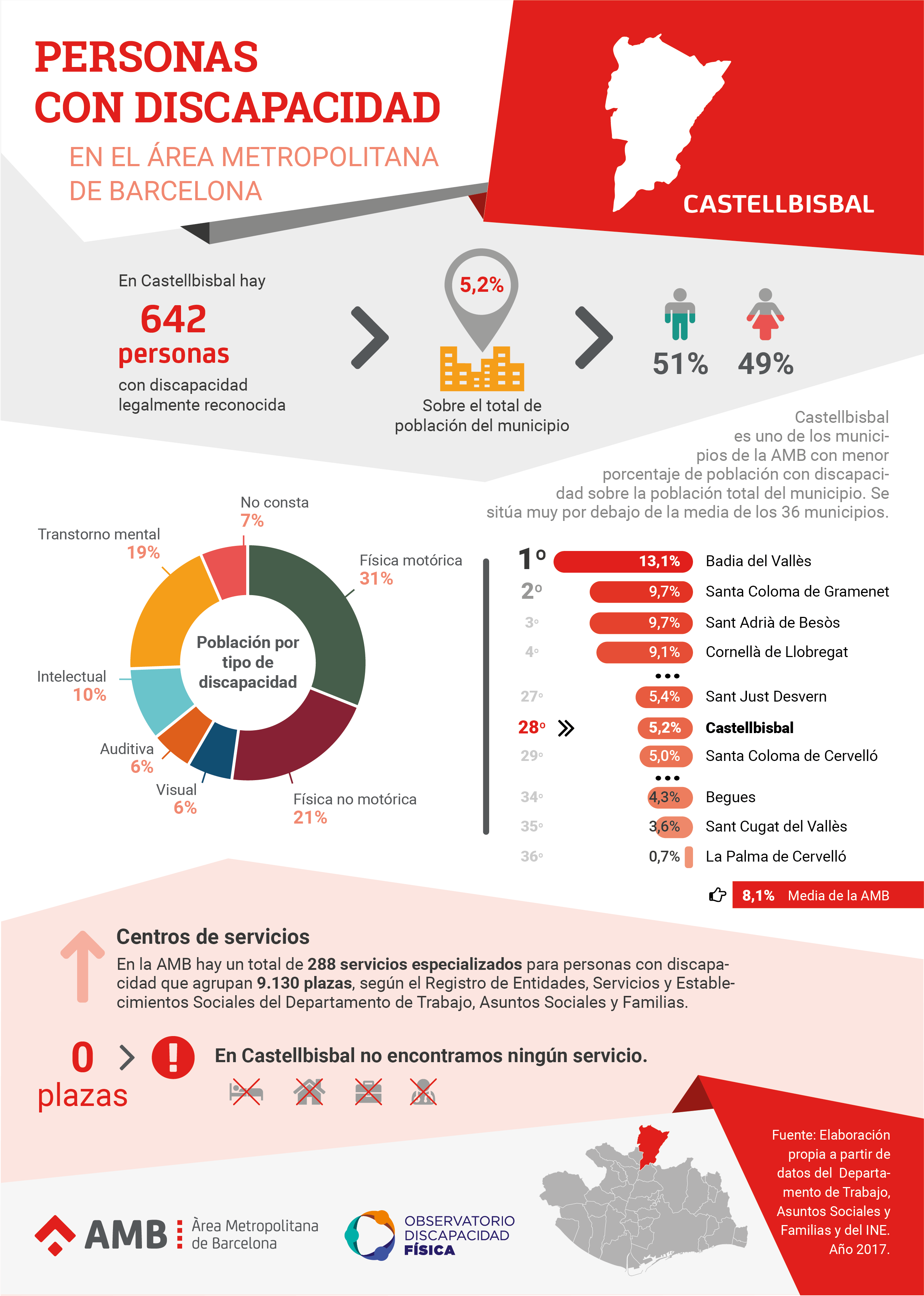 Según el Registro de Entidades, Servicios y Establecimientos Sociales del Departamento de Trabajo, Asuntos Sociales y Familias, en la AMB hay un total de 288 servicios especializados para personas con discapacidad que suman 9.130 plazas. En Catellbisbal no encontramos ninguno de ellos.