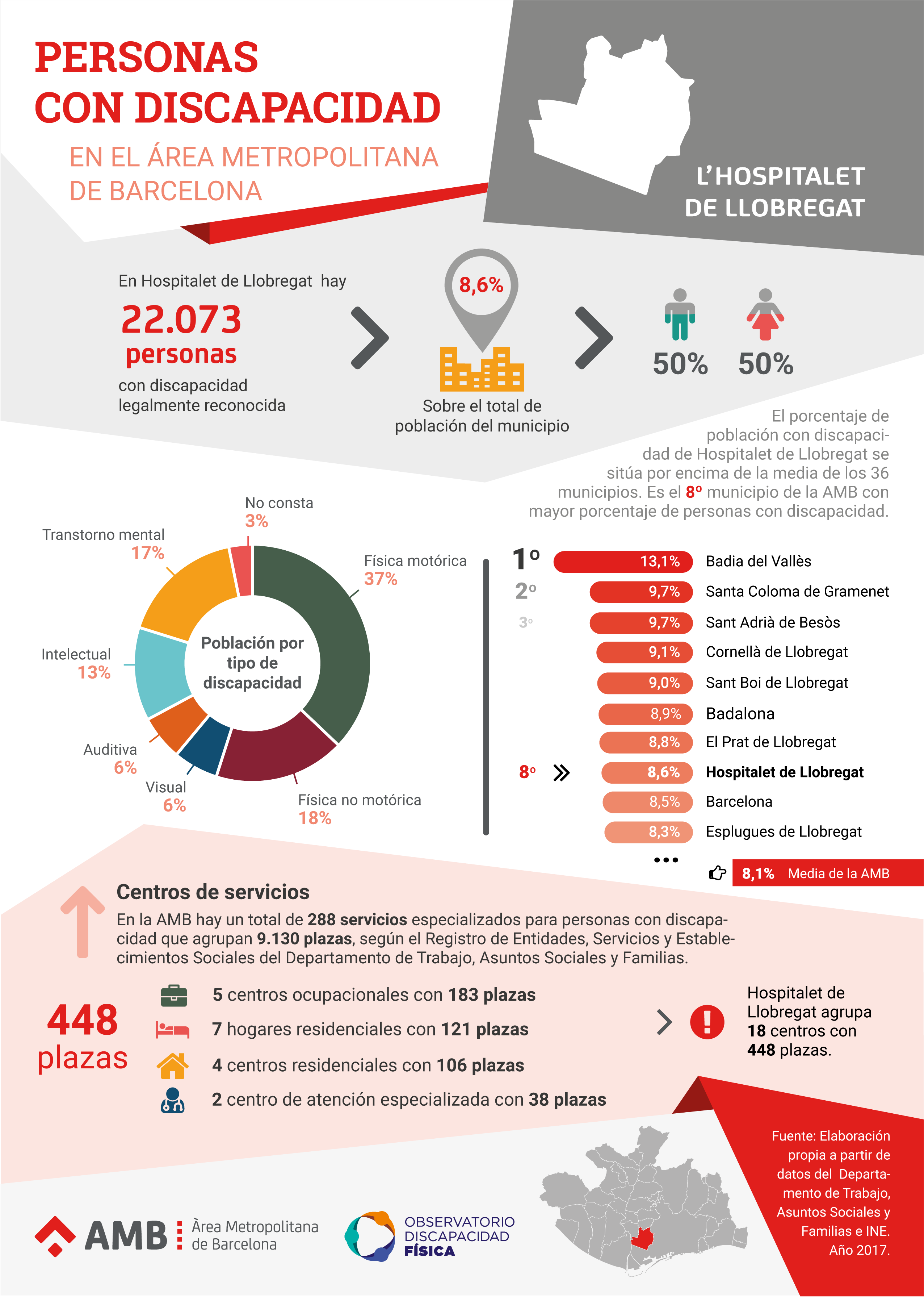 Según el Registro de Entidades, Servicios y Establecimientos Sociales del Departamento de Trabajo, Asuntos Sociales y Familias, en la AMB hay un total de 288 servicios especializados para personas con discapacidad que suman 9.130 plazas. El Hospitalet de Llobregat agrupa 18 centros de servicios con 448 plazas.